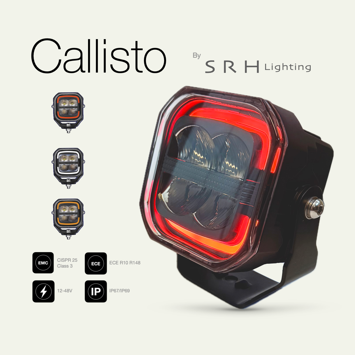 The Callisto is a 5-inch square driving light featuring tri-colour side lights in white, amber, and red. Delivering 4,700 lumens, it boasts an IP69 rating for exceptional durability. Compatible with 12-48V systems and certified with a CISPR 25 Class 3 EMC rating, the Callisto stands out as one of the most robust driving lights available.